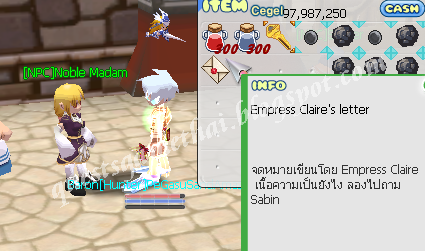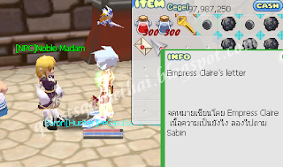 3.กลับไปคุยกับ Noble Madam เลือกข้อ1.ท่านสวมมงกุฏ คุยต่อเลือกข้อ1.ข้าพร้อมสำหรับคราสใหม่แล้ว คุยต่อเลือกข้อ1.ตกลง จะได้ซองจดหมาย Empress Claire's letter